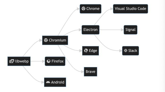 实际上,从谷歌的信息中,可以看出该漏洞源自谷歌于 2010 年开发的 libWebp 代码库,用于以 Webp 格式渲染图像。Webp 是当时的一种新兴格式,能够让文件体积比 PNG 图像再降低 26%。libwebp 几乎被整合进各种应用、操作系统及其他渲染 Webp 图像的代码库当中,其中最知名的当数 Chrome 中使用的 Electron 框架,以及在桌面和移动设备上运行的各类应用产品。