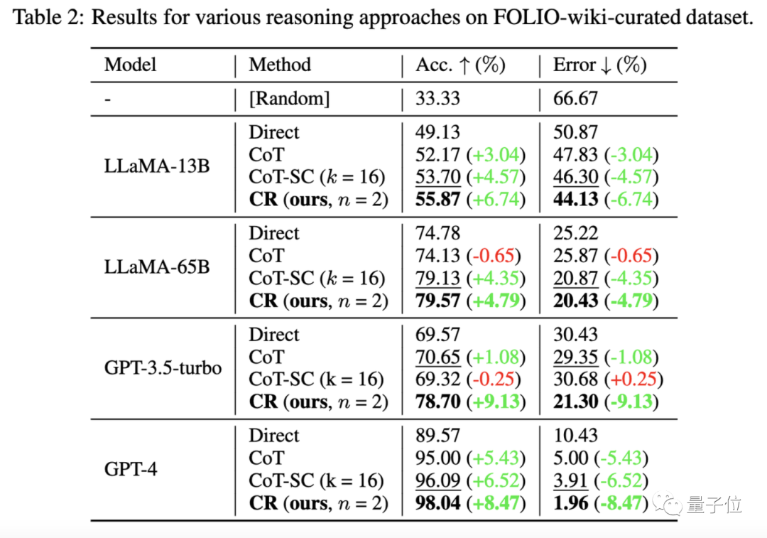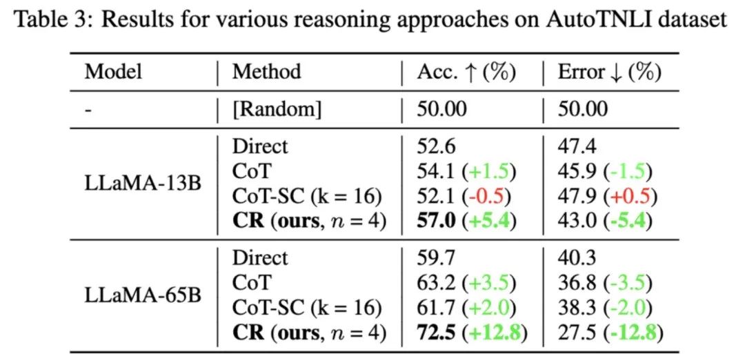 与CoT方法相比,CR显著提高了LLaMA-13B、LLaMA-65B的性能。