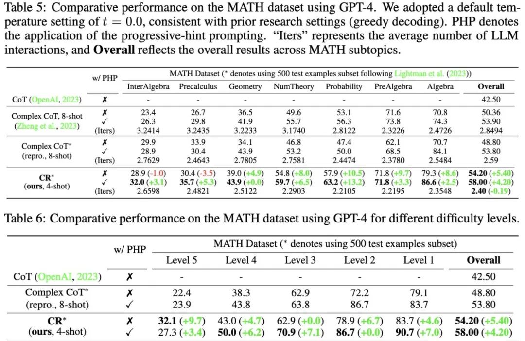 实验结果表明,CR在两种不同的实验设定下,正确率均超出当前已有方法,总体正确率可达58%,并在Level 5的难题中实现了42%的相对准确率提升,拿下了GPT-4模型下的新SOTA。
