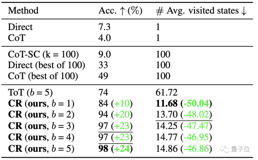 最终CR方法的正确率甚至能达到98%(ToT为74%),且平均访问状态数量要比ToT少很多。