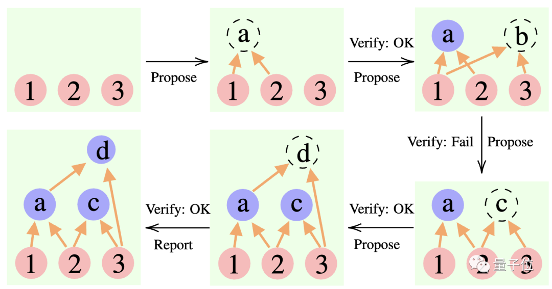 累积推理正是在此基础上,加入了一个“验证者”,及时判断对错。由此模型的思考框架也从链状和树状,变成了更复杂的“有向无环图”。
