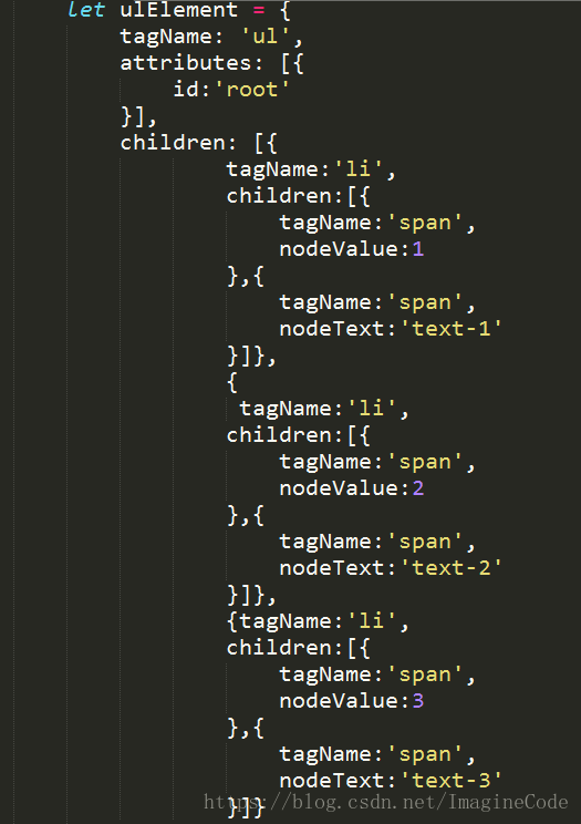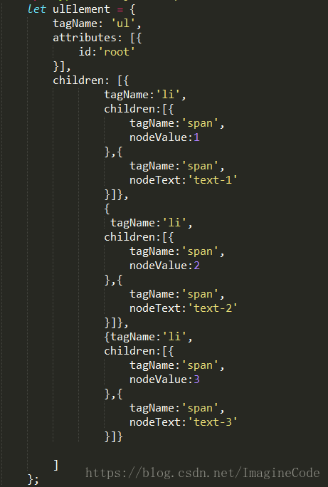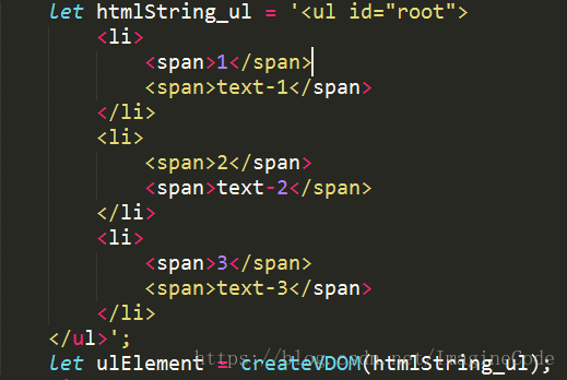 根据上图,在createVDOM的实现上,需要逐个分析字符串htmlString_ul中的字符,根据词法分析内容,将标签名字存入tagName,属性存入attributes,子标签内容存入children。