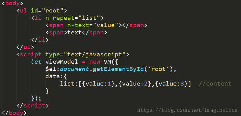 简单而言,ViewModel里的数据就是描述页面View内容的另一种数据结构,不过需要结合特定的MVVM描述语法编译生成完整的DOM结构。那么,结合后上面的代码就变成下面这样: