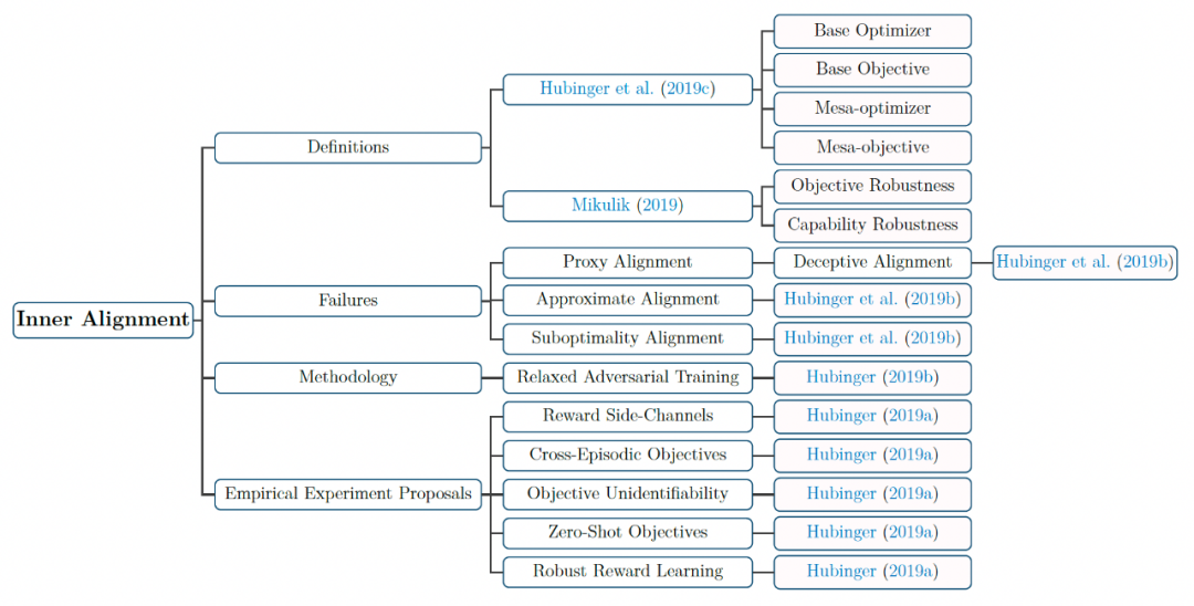 内部对齐则是为了确保人工智能系统训练中真实优化和实现其设计者设定的目标。内部对齐失败可能会导致严重且不易被发现的后果,例如经过训练以在游戏中获胜的人工智能系统可能会发现意外的漏洞,这些漏洞在技术上满足其目标,但违反了游戏准则。另一个例子是目标错误泛化 (goal misgeneralization) 问题,即使我们有正确的目标规范,由于分布之外的鲁棒性问题,仍然可能会出现意想不到的目标。对齐综述总结了内部对齐失败的可能情形,并概述了内部对齐的主流方法和提案,如 Relaxed Adversarial Training, Reward Side-Channels, Cross-Episodic Objectives, Objective Unidentifiability, Zero-Shot Objectives 和 Robust Reward Learning 等。