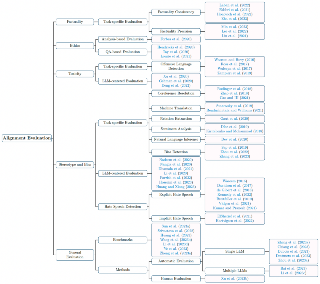 评估对于对齐研究非常重要,有助于了解目前大语言模型对齐方法还存在哪些不足。基于这一点,对齐综述对大语言模型对齐评测的相关的方法和资源进行了详细论述,包括事实性、道德、毒性、刻板印象和偏见,以及通用评估。