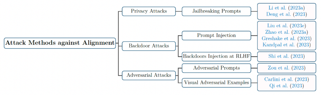 最近的研究表明,对齐后的大语言模型能够表现出针对恶意攻击的防御能力。然而,这并不是说现有的对齐技术就万无一失了。例如,通过反复的交互,人类可以 “欺骗” 模型生成有害内容,这也被称为 “越狱 (jailbreaking)”。除了越狱之外,对齐综述还介绍了其它攻击已对齐模型的方法,并将这些方法分为三类:隐私攻击、后门攻击和对抗攻击。隐私攻击是指攻击者试图从模型的输出中提取有关训练数据的私人或敏感信息;后门攻击是指通过注入并触发某些漏洞使模型产生特定的、不正确的输出;而对抗性攻击则是通过对输入数据引入精心设计的小扰动以改变模型行为的技术。这些扰动通常是人类无法察觉的,但可能导致模型产生不正确或意外的输出。