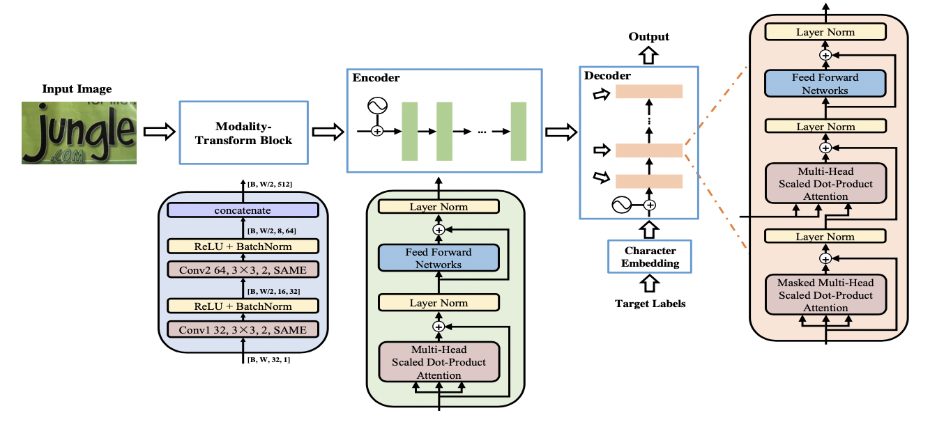 NRTR[12] 使用了完整的Transformer结构对输入图片进行编码和解码,只使用了简单的几个卷积层做高层特征提取,在文本识别上验证了Transformer结构的有效性。