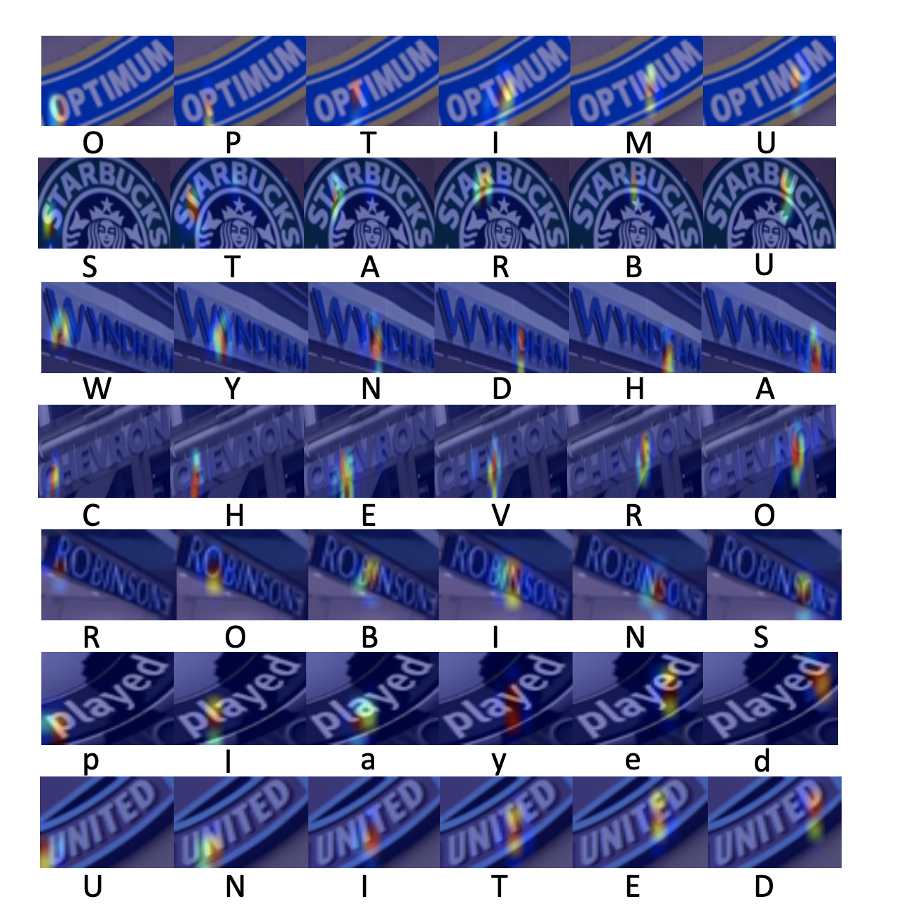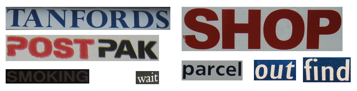 下图展示的是 IC15 和 IC13 的数据样式,它们分别代表了不规则文本和规则文本。可以看出不规则文本往往存在扭曲、模糊、字体差异大等问题,更贴近真实场景,也存在更大的挑战性。
