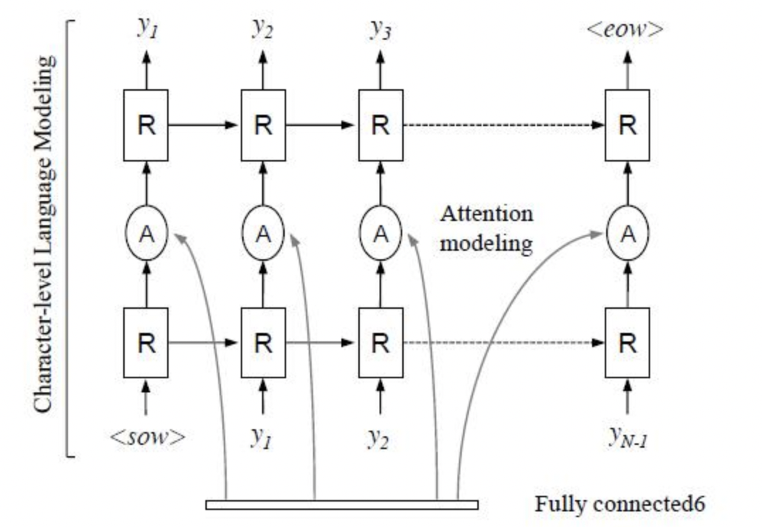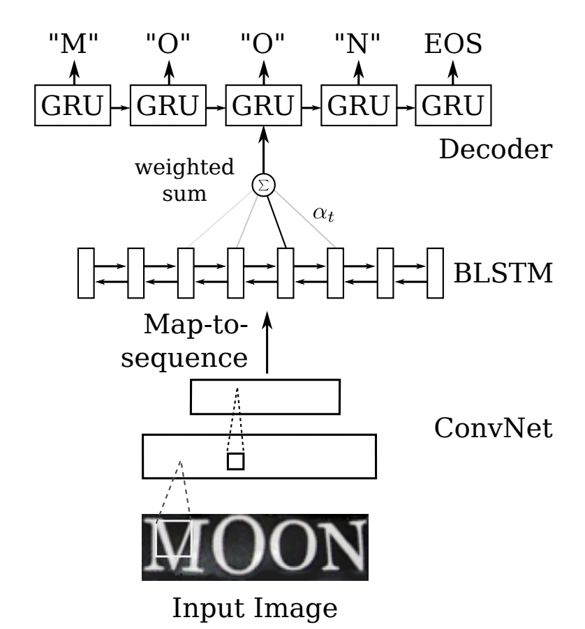 R^2AM [7] 首次将 Attention 引入文本识别领域,该模型首先将输入图像通过递归卷积层提取编码后的图像特征,然后利用隐式学习到的字符级语言统计信息通过递归神经网络解码输出字符。在解码过程中引入了Attention 机制实现了软特征选择,以更好地利用图像特征,这一有选择性的处理方式更符合人类的直觉。