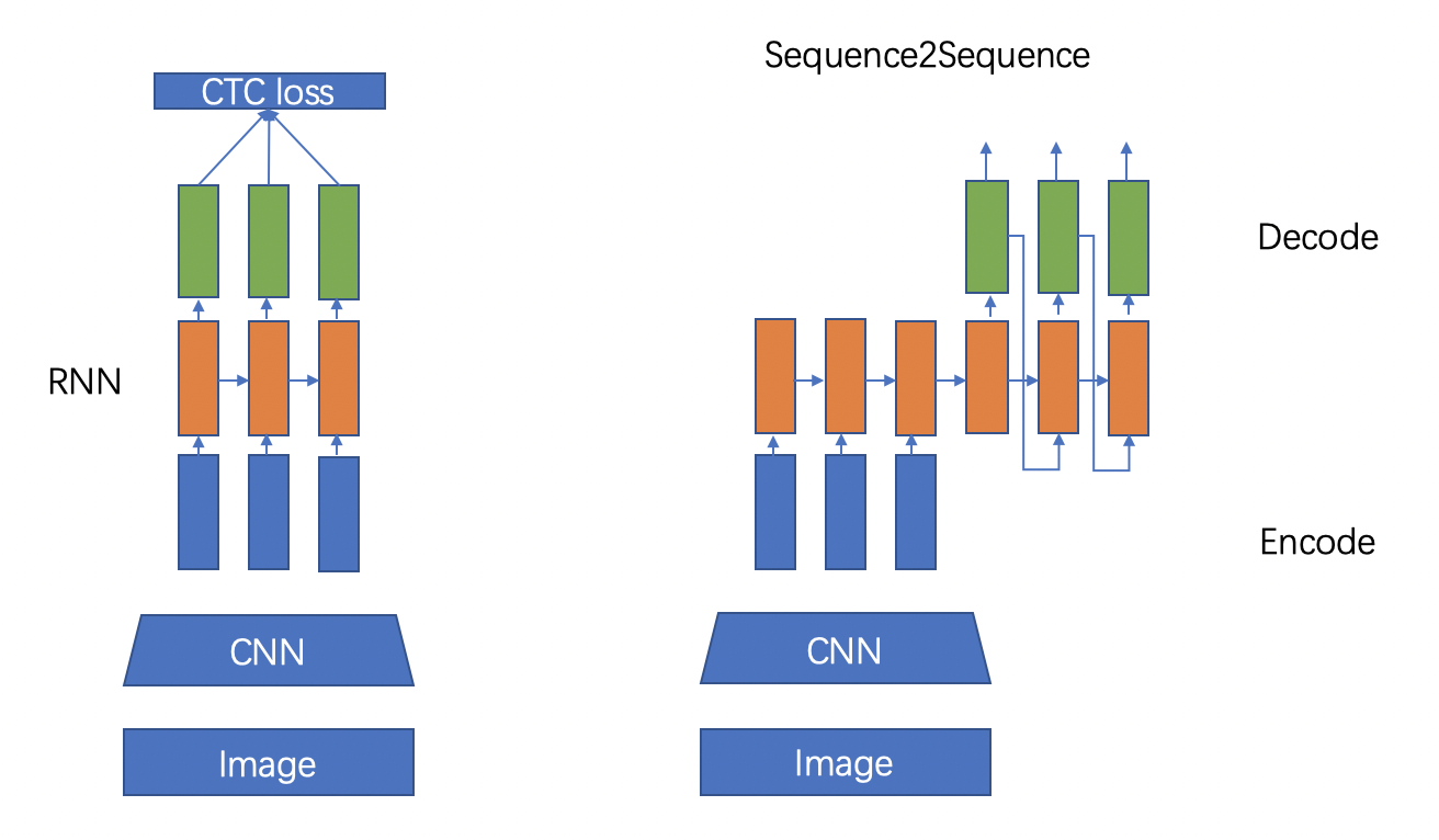 基于 CTC 的算法是将编码产生的序列接入 CTC 进行解码;基于 Sequence2Sequence 的方法则是把序列接入循环神经网络(Recurrent Neural Network, RNN)模块进行循环解码,两种方式都验证有效也是主流的两大做法。
