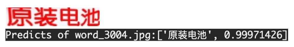 具体地,模型输入一张定位好的文本行,由模型预测出图片中的文字内容和置信度,可视化结果如下图所示:
