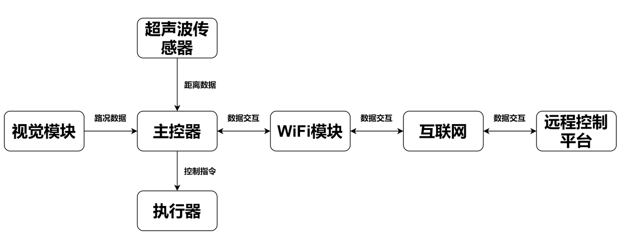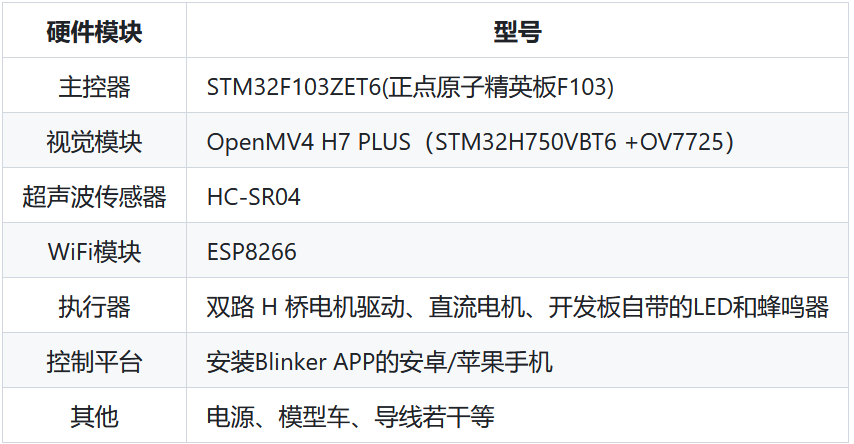 主要依靠机器视觉模块OpenMV通过图像处理的方式获取实时的路况信息,以及超声波传感器获取障碍物距离信息,得到的路况数据再通过串口传输到主控器STM32上面,STM32会将实时的路况信息处理成智能小车的运动控制指令,让智能小车实现红绿灯识别、交通标志识别以及车道实时保持的功能,还有STM32也会通过WiFi模块ESP8266与手机端进行路况数据和控制指令的远程交互。硬件系统框图如下: