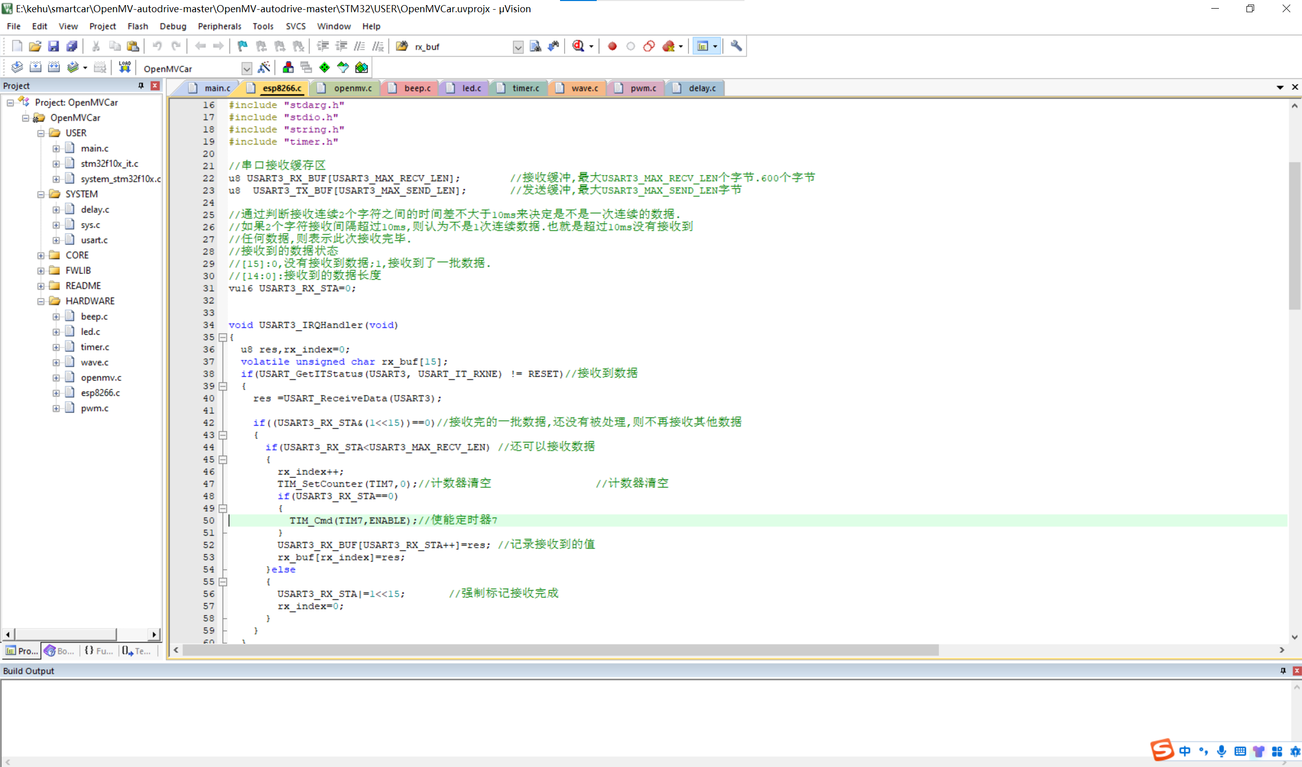 关于直流电机的PID调节,主要用来实现车道保持功能。通过OpenMV返回的偏转角度,进行实时调节电机PWM输出,使得偏转角度Y=50(也就是小车与中线的偏转角为0,由于之前为了传输方便整体加上了50)。故将设定值定为50,通过实时返回的Y值与50做差值运算,得到PID的输入偏差,通过位置式PID返回实时的PWM值。关于PID控制算法,之前也有介绍到,这里不再深入赘述。