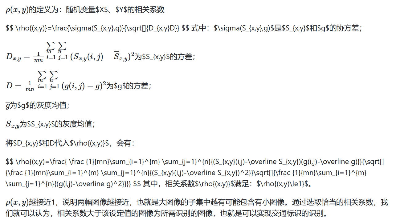 NCC算法的基本实现原理:主要是通过求两幅大小相近的图像的相关系数矩阵来判别两幅图像是否相关。假设需要识别的初始图片g的大小为m×n,摄像头拍摄到的图片S的大小为M×N,其中的以(x,y)为左上角点与g大小相同的子图像为S_{(x,y)}。具体的利用NCC算法实现计算图像相似度的方法如下:
