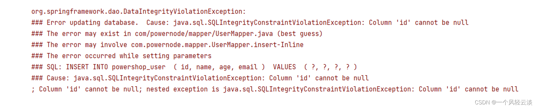 }这里如果我们省略不写id,会发现,无法插入数据