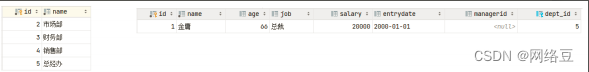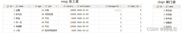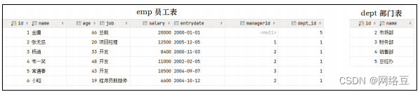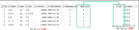 左侧的 emp 表是员工表,里面存储员工的基本信息,包含员工的 ID 、姓名、年龄、职位、薪资、入职日期、上级主管 ID 、部门 ID ,在员工的信息中存储的是部门的 ID dept_id ,而这个部门的 ID 是关联的 部门表 dept 的主键 id ,那 emp 表的 dept_id 就是外键 , 关联的是另一张表的主键。