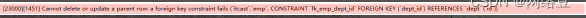添加了外键约束之后,我们再到 dept 表 ( 父表 ) 删除 id 为 1 的记录,然后看一下会发生什么现象。 此时将会报错,不能删除或更新父表记录,因为存在外键约束。