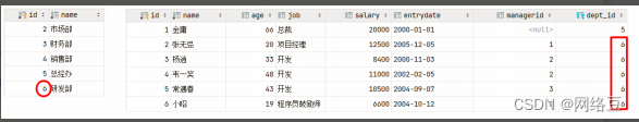 我们发现父表的记录是可以正常的删除的,父表的数据删除之后,再打开子表 emp ,我们发现子表 emp的 dept_id 字段,原来 dept_id 为 1 的数据,现在都被置为 NULL 了。