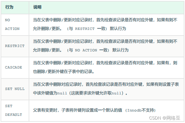 alter table emp drop foreign key fk_emp_dept_id;添加了外键之后,再删除父表数据时产生的约束行为,我们就称为删除 / 更新行为。具体的删除 / 更新行为有以下几种: