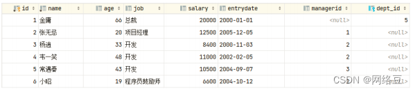 (1, '金庸', 66, '总裁',20000, '2000-01-01', null,5),(2, '张无忌', 20,