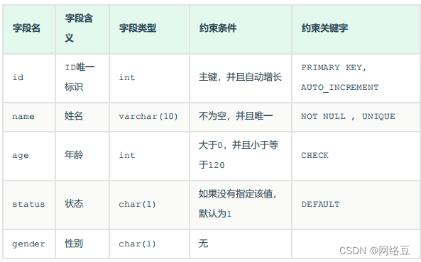 );在为字段添加约束时,我们只需要在字段之后加上约束的关键字即可,需要关注其语法。我们执行上面的 SQL 把表结构创建完成,然后接下来,就可以通过一组数据进行测试,从而验证一下,约束是否可以 生效。
