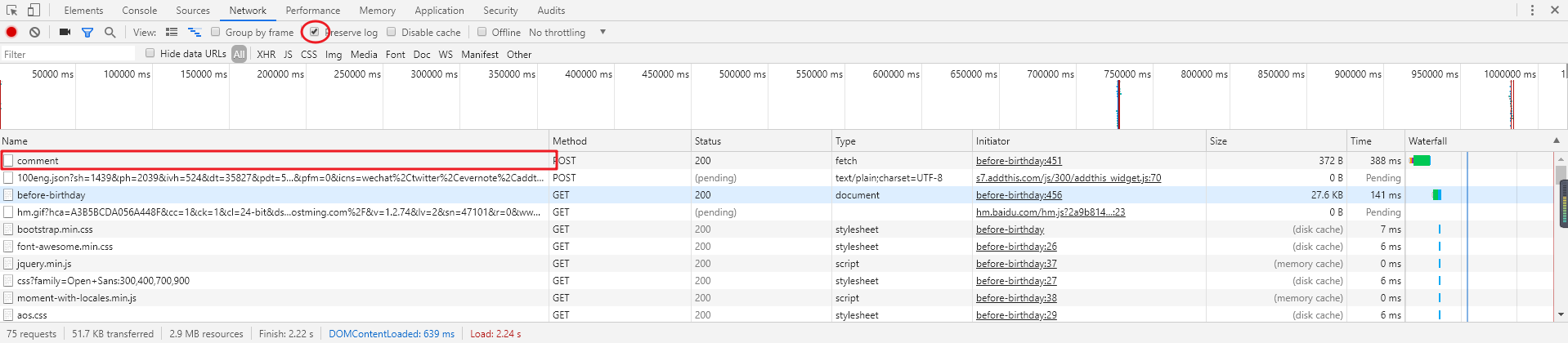 举例来说,比如现在我开发了博客的评论功能,想知道发送评论是否正常工作。那么打开 Network 面板,在页面中添加一条评论并提交,在 Network 中就应该能看到一条请求的记录,为防止页面刷新记录丢失,可以勾选上 Preserve 框: