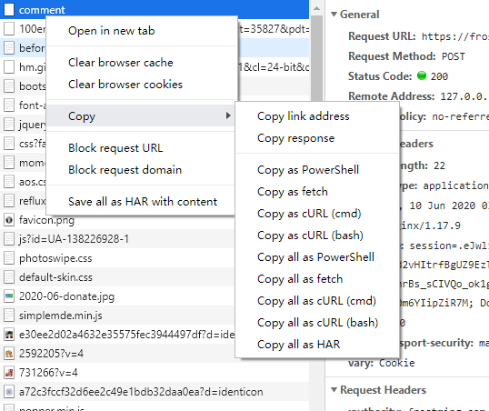 在请求记录上右键点击可调出菜单,可以做很多事情。比如在新标签打开、清除浏览器缓存/Cookies、将连接复制为 PowerShell 脚本、fetch 调用、curl 命令等等。