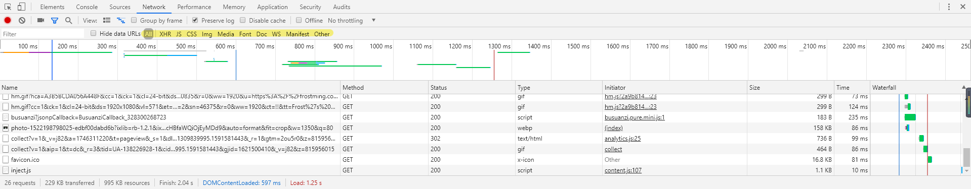 打开 Network 面板,然后刷新页面,可以看到当前页面发送的所有请求,其中大部分是加载静态文件