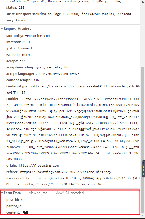 清空当前列表。可以看到comment请求方法是POST,已经返回 200 成功了。点选这条记录,可以在右侧看到请求响应的详情: