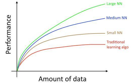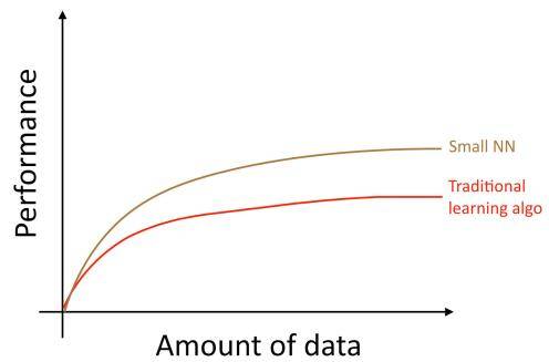 对于原来传统算法,当你数据量增加的时候,算法的效果并不能随着数据量的增加而提升,根本原因在于传统的算法并不能“掌控”所有的数据。