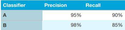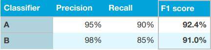 准确率和召回率就不是单一的了,它提供了两个指标衡量你的算法好坏。但正是因此,我们并不好评价哪个算法比较好,正如上方的分类算法A和B的两个指标,做出选择是比较困难的。