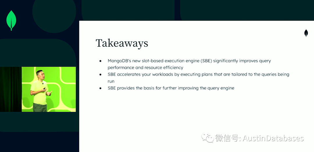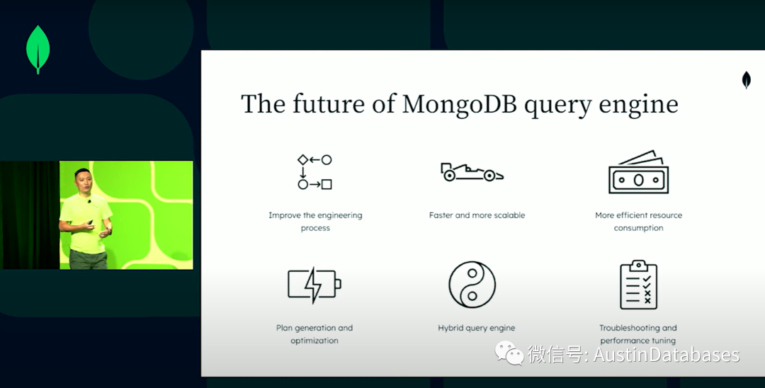 通过实际的查询我们让客户了解到SBE的性能,我们未来将把查询引擎做的更加稳定和高效。同时确保我们的每个查询都在最好的引擎上运行,在前面有一些同学介绍了数据平台的部分,这说明MONGODB 不是一个文档数据库,也不是一个仅仅可以插入,更新,删除数据的文档数据库,我们希望他是一个能够进行应用分析工作的产品。(MongoDB要进军 OLAP),所以我们希望我们的MongoDB 变得和混动汽车的发动机一样,具有双擎的力量。最重要的是我们要不断的改变,并让客户享受到最好的数据库引擎。
