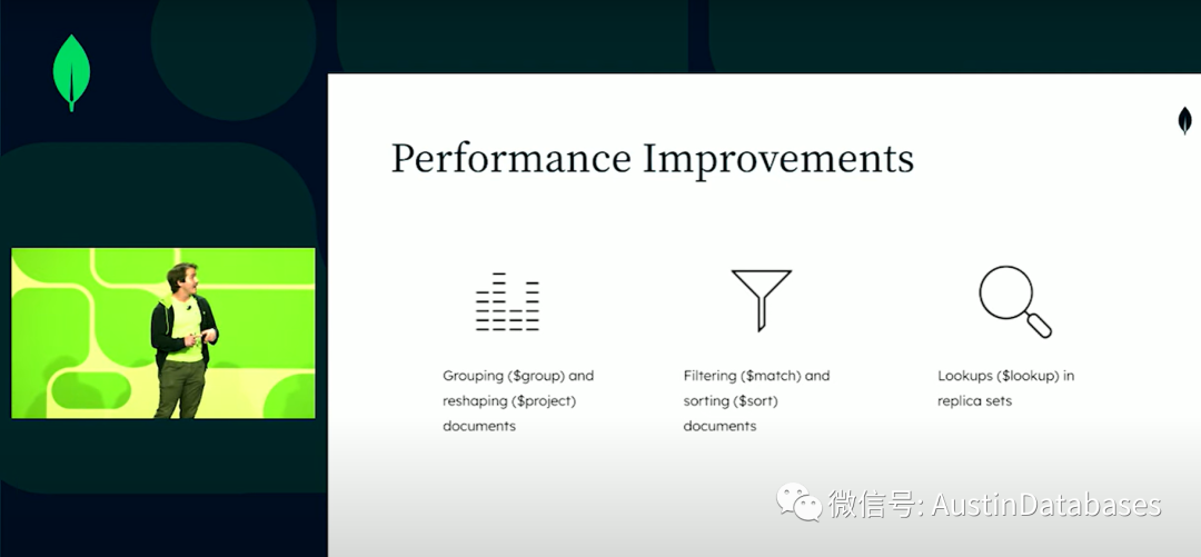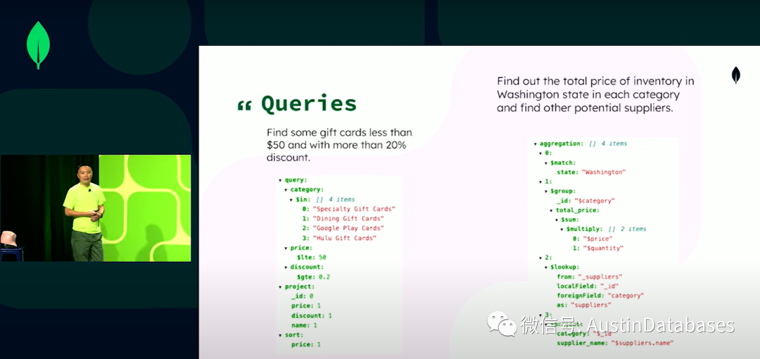 使用过购物网站的都知道,你搜索出来的东西都是简单的介绍,无法看到有效的详细介绍,所以这里我们仅仅展示折扣和产品名称和价格并按照价格排序。第二个是一个聚合操作,在华盛顿州每个品类库存的总价,并提供全国可以提供产品的供应商名单,所以对于聚合,第一步是匹配按照州来进行筛选,然后我们进行分组并计算每个门类的总价格,查找最终汇聚出我们要的结果。后面是一个视频,通过Altas 来进行,这里他创建了两个集群 6.3 和5.0 来对同样的查询进行对比,这里简略其中的过程,直接说结果,结果是大约10.2毫秒,1000万的数据,经典的引擎是16毫秒,下面我们针对第二个查询将进行比对SEB需要13秒,经典需要21秒只做了查询的21%。