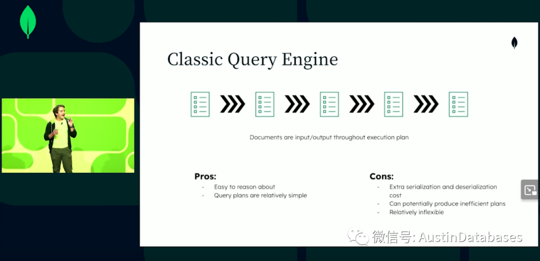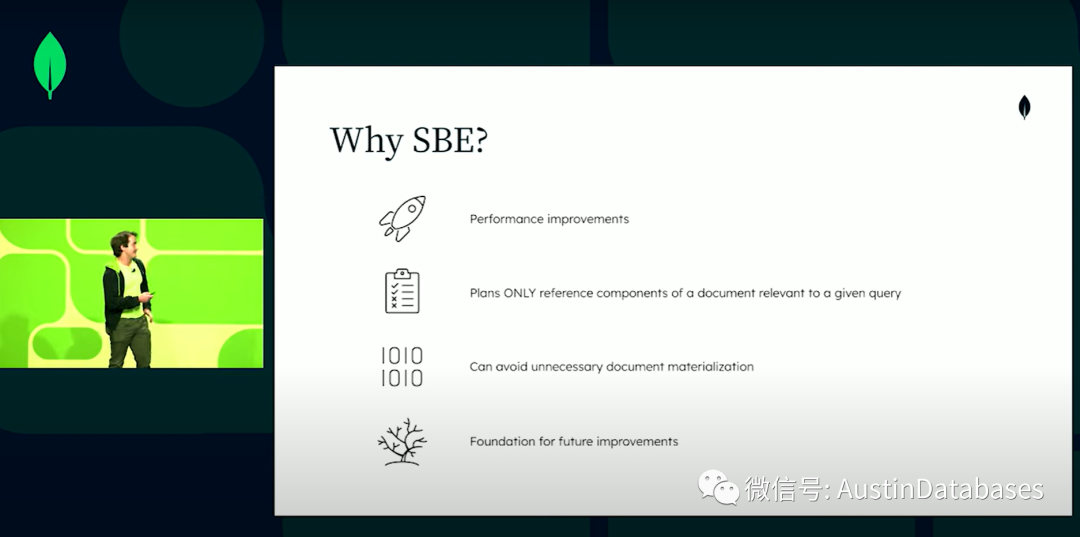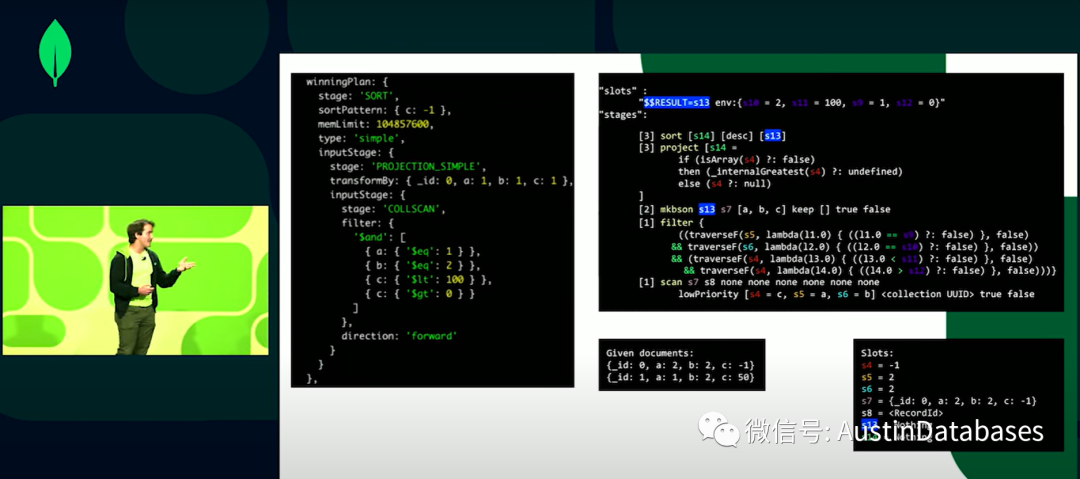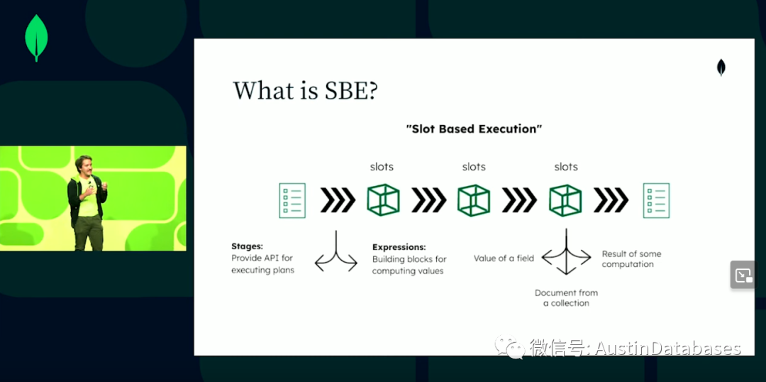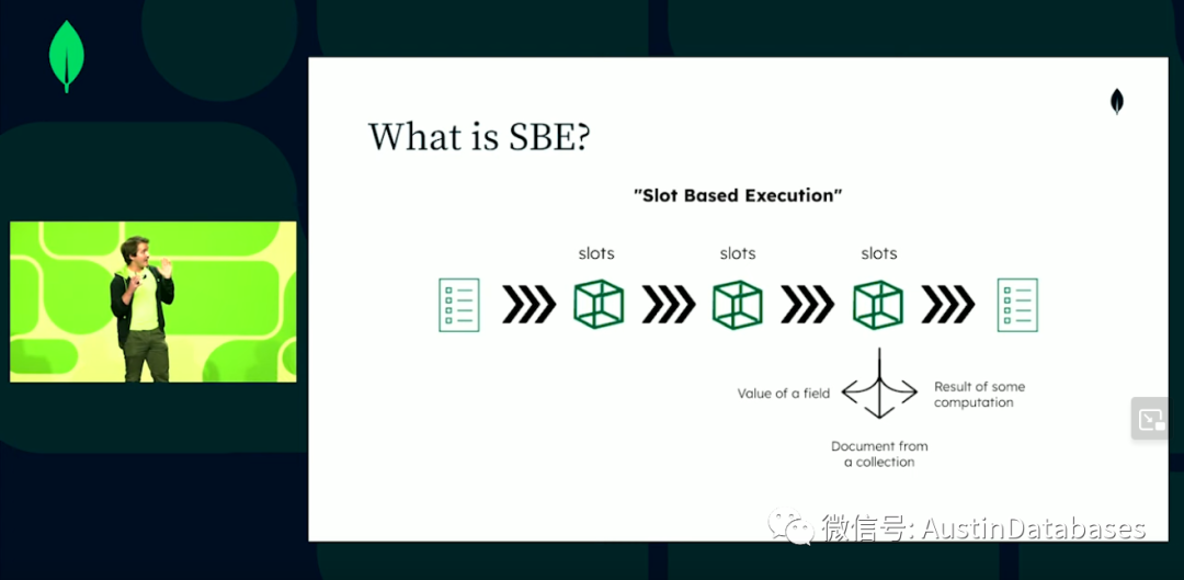 下面我们就介绍一下我们新的引擎,有谁知道SBE,请举手。嗯人不多,正如刚才晓晨讲的,SBE = slot based execution ,基于插槽方式的执行的方式,原来的经典引擎面对的是document 而现在的引擎基于的是值,我们要做的是把我们查询的值,调出来,然后和插槽进行绑定,插槽就有了唯一标识符,在整个的查询计划中使用这个值 ,所以我们从集合或任何其他的上下文中读取文档,新的方式中我们在并不是绑定文档,而是绑定文档里面的值或者是产生的中间的结果,这里最大的不同是