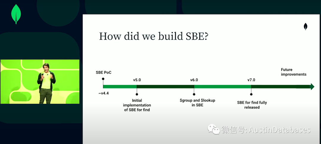 这里我们已经讲述了SBE的优点,那么我们团队是怎么做到这一点的,正如晓晨刚才提到的,这是一个花了多年的过程,在4.4发布的2019-2020年,当时实现了SBE的雏形,通过POC我们构建了等效的传统查询的SBE,明显查询的性能要优于之前的传统查询引擎,不幸的是我们由于发布的周期,我们仅仅在5.0上初步实现了一小部分,时间到了6.0这里我们化了一些时间,主要的目的是扩展SBE的功能集合。我们提供了$符号的查找,但是我们在一些更加细致的查询中,经典引擎的查询性能还是高于SBE,在7.0这个版本SBE走向了成熟,完全可以使用FIND来进行查询在2022年我们一年都在为提高SBE的性能做着努力。同时我们还要花费时间,将生成的计划做好,这是一件非常困难的事情。