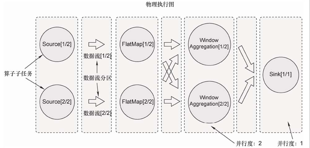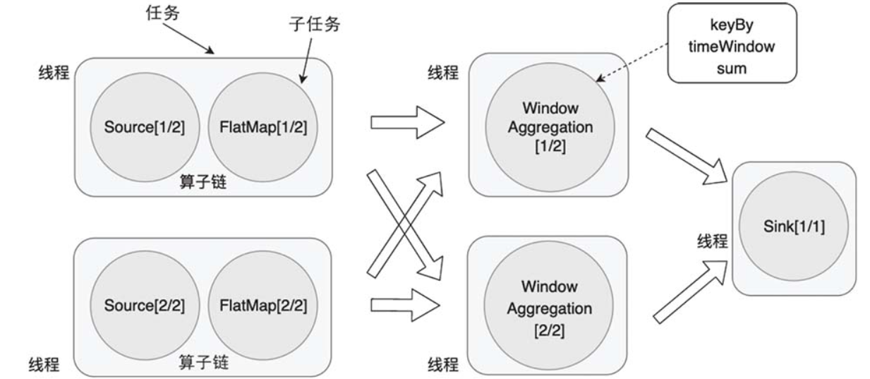 在分布式计算环境下,执行计算的单个节点(物理机或虚拟机)被称为实例,一个算子在并行执行时,算子子任务会分布到多个节点上,所以算子子任务又被称为算子实例(Instance)。即使输入数据增多,我们也可以通过部署更多的算子子任务来进行横向扩展。除去Sink外的算子都被分成了2个算子子任务,它们的并行度(Parallelism)为2,Sink算子的并行度为1。并行度是可以被设置的,当设置某个算子的并行度为2时,也就意味着这个算子有2个算子子任务(或者说2个算子实例)并行执行。实际应用中一般根据输入数据量的大小、计算资源的多少等多方面的因素来设置并行度。