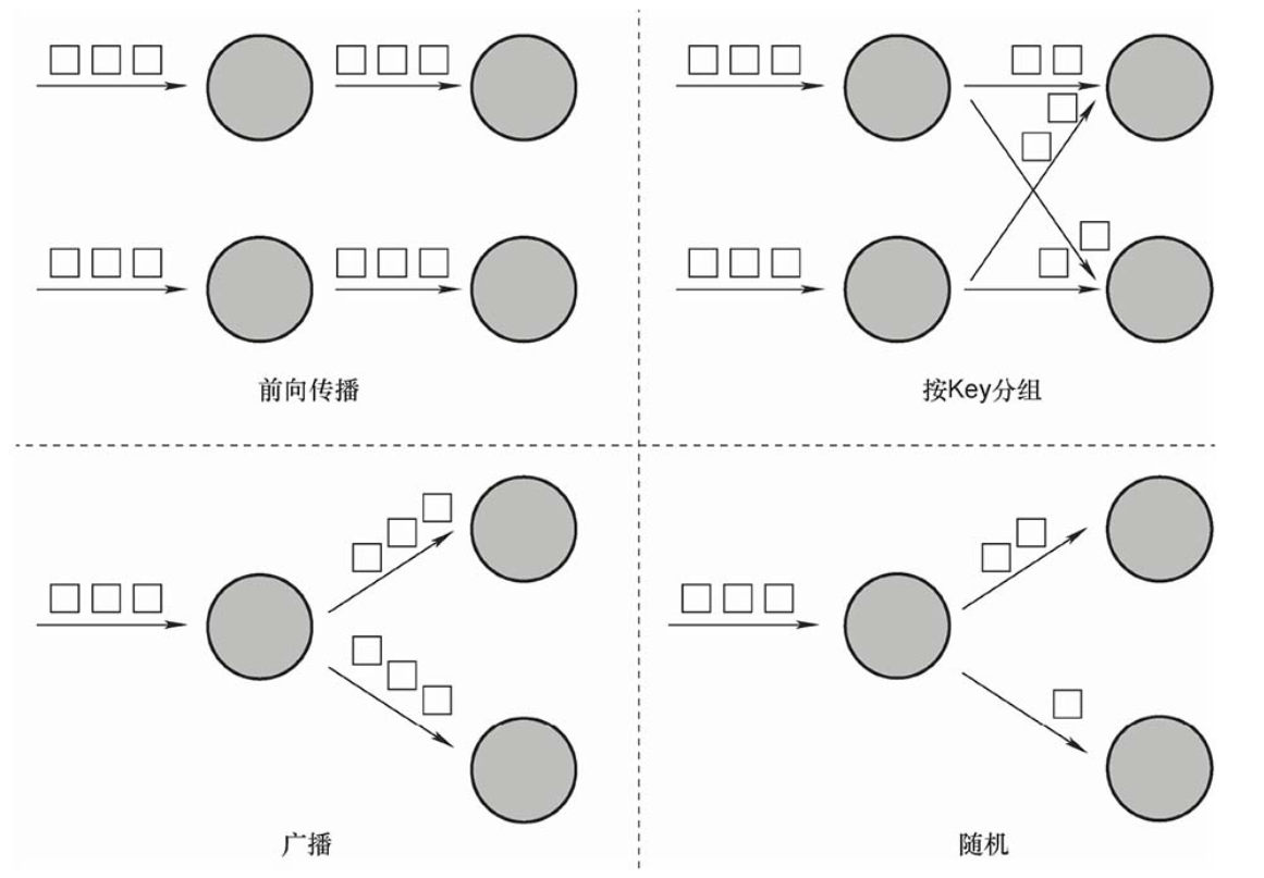 图中出现了数据流动的现象,即数据在不同的算子子任务上进行数据交换。无论是Hadoop、Spark还是Flink,都会涉及数据交换策略。常见的数据交换策略有4种,如下所示。