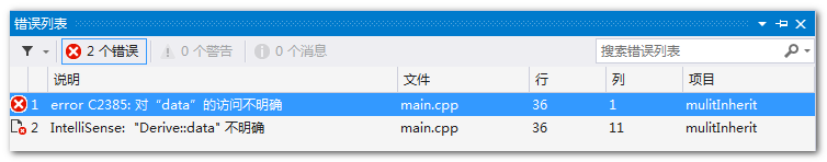 }以上代码编译后,会提示 data 不明确,这也就造成了二义性问题,子类不知道该选择哪一个了。如下图: