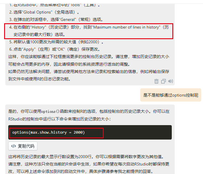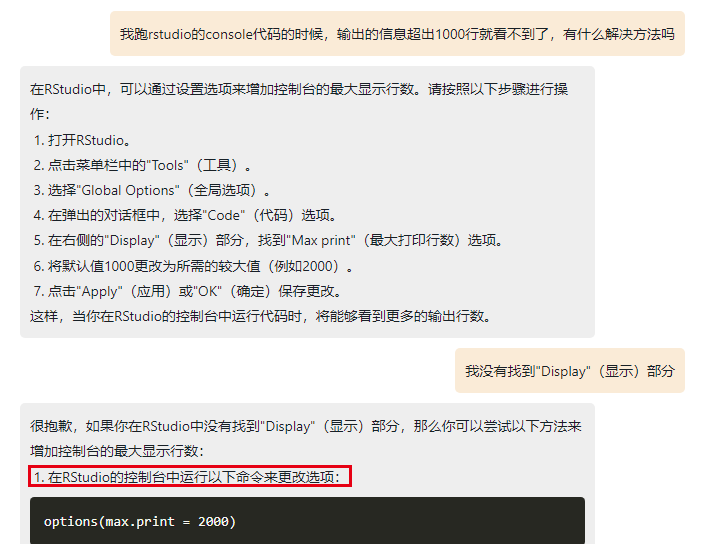 我们通过求助chatGPT,通过BioinfoArk提供的中国区chatGPT查询,发现它给出来的options命令里面的max.print设置 并不是我们需要的