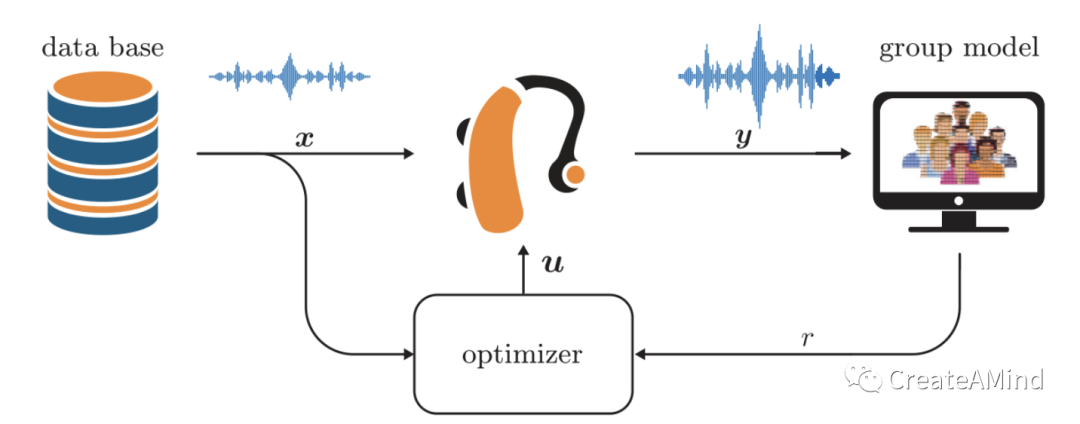 声学模型中的推断基于观察到的信号x,并产生输出y和上下文c。基于该上下文信号c和先前的用户评估r,AIDA将主动提出新的参数试验u,目标是使用户满意。从技术上讲,目标是相对于不进行参数调整,AIDA期望在未来收到更少的负面评价,详见第3.2节。