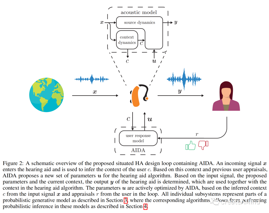 图2:提议的包含AIDA的情境HA设计循环的示意图。输入信号x进入助听器,并用于推断用户c的环境。基于该环境和先前的用户评估,AIDA为助听器算法提出一组新的参数u。基于输入信号、建议的参数和当前环境,助听器的输出y被确定,其在助听器算法中与环境一起使用。参数u由AIDA基于从输入信号中推断的上下文c和来自环路中用户的评估r主动优化。所有单独的子系统都代表第3节中描述的概率生成模型的一部分,其中相应的算法来自于在第4节中描述的这些模型中执行概率推理。