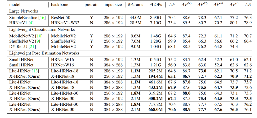 如表2所示,针对不同的输入大小与模型深度,X-HRNet在性能上都全面超过了 Lite-HRNet。与大型姿势估计网络 SimpleBaseline 相比,X-HRNet-30也显著减少了计算复杂性。