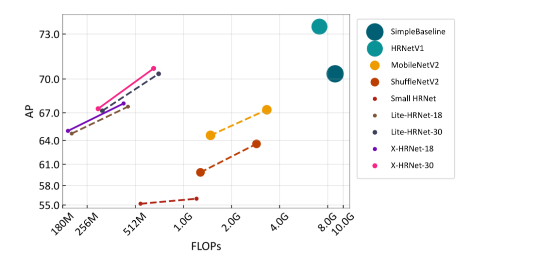 如图2所示,X-HRNet网络在浮点计算方面具有明显优势。与专为分类任务设计的主流轻量级网络 MobileNetV2 和 ShuffleNetV2 相比,X-HRNet 在性能上具有明显优势。与在ImageNet数据集上预训练的 ShuffleNetV2 网络相比,X-HRNet-30 显著提高了7.6个 AP 分数,只需要28%的FLOPs。同时 X-HRNet-18 在性能上也超过了小型 HRNet,只需要35%的FLOPs。证明了SUSA模块在捕捉高分辨率细节方面具有明显优势