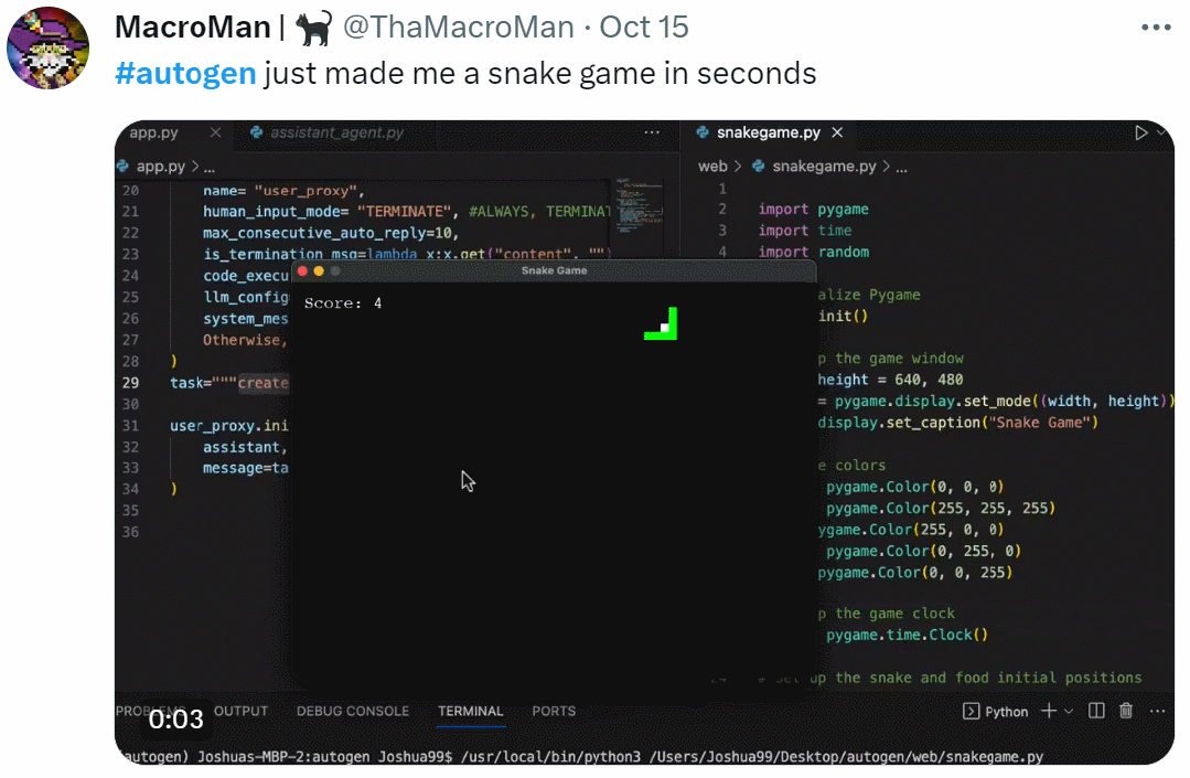 还有网友表示:「AutoGen 在几秒钟内帮我制作了一个贪吃蛇游戏」。