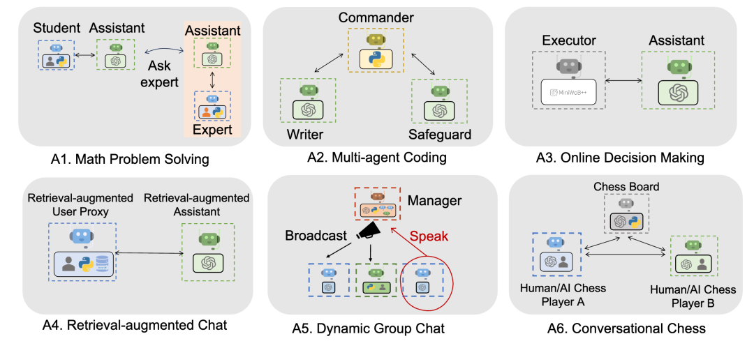 下图显示了使用 AutoGen 构建的六个应用程序示例,包括数学问题解决、多智能体编码、在线决策制定、检索增强聊天、动态群聊以及对话式国际象棋。