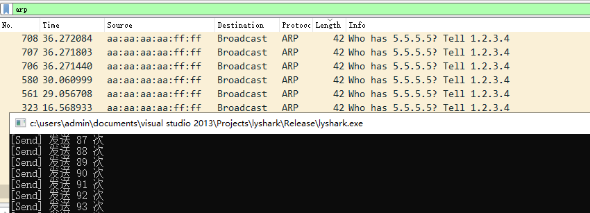 在数据包的构造完成后,程序进入了一个循环,每隔1秒钟发送一次数据包,总共发送100次。发送的数据包以 sendbuf 变量的形式进行传输,大小为42字节(即ARP包的结构体大小)。在每次成功发送数据包后,程序会在控制台输出一条带有发送次数的消息。
