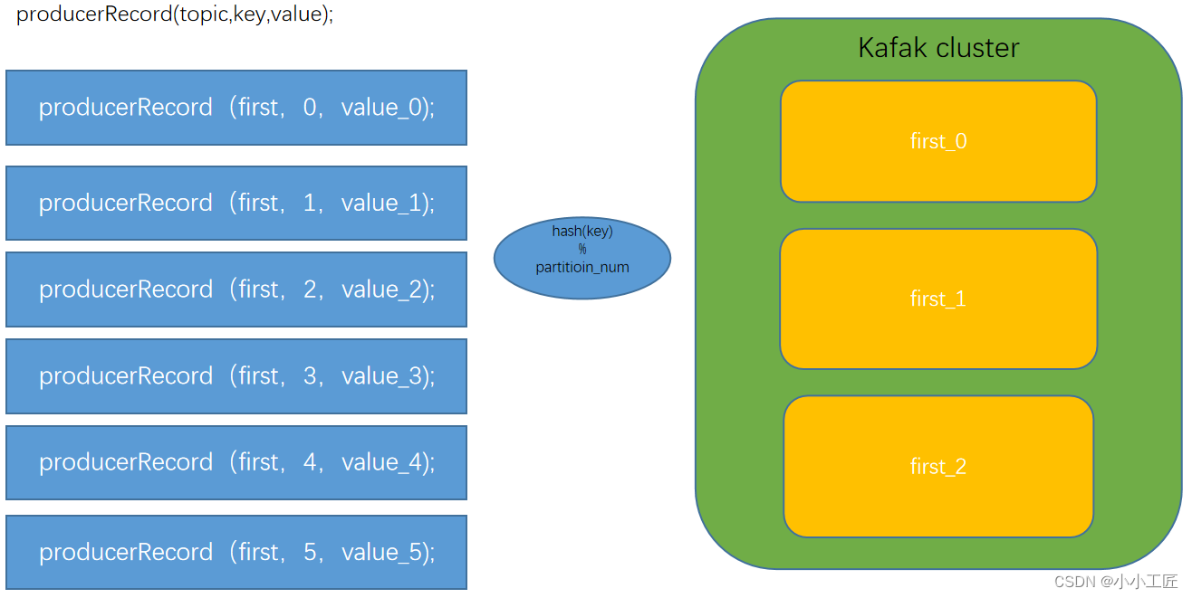 ProducerRecord(topic, key, value) | 没有指明 partition 值但有 key 的情况下:将 key 的 hash 值与 topic 的 partition 个数进行取余得到分区号 |