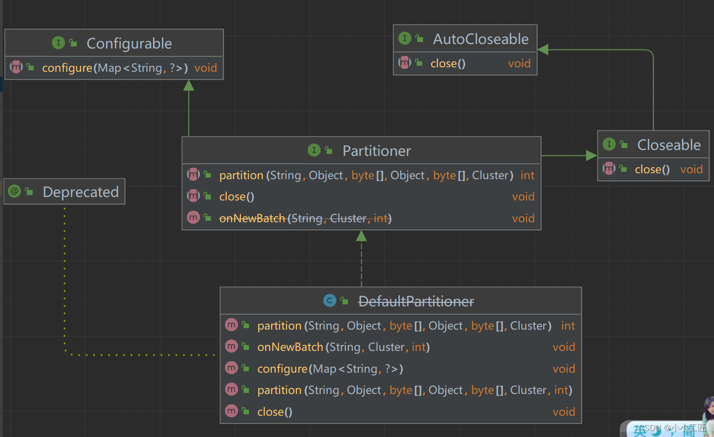 除了使用 Kafka 提供的默认分区器进行分区分配,还可以使用自定义的分区器,只需同DefaultPartitioner 一样实现 Partitioner 接口即可。