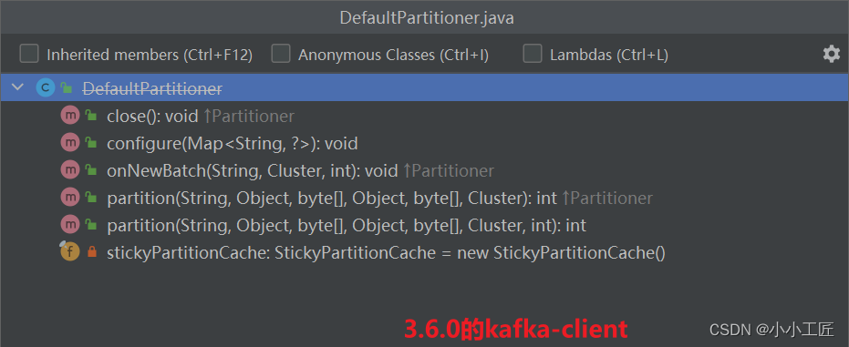 在默认分区器 DefaultPartitioner 的实现中,close()是空方法,而在 partition()方法中定义了主要的分区分配逻辑。