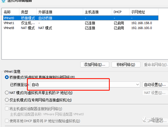 随后就重置了下网络设置,按理说应该可以恢复了,但是还是显示vmnet0的桥接网络没有自动连接到物理网卡,网上搜查了一下就是之前升级卸载过一次造成的原因,可能是没有卸载干净,所以把相关目录和注册表都清理了一下,重新安装之后发现问题解决了,显示自动连接。